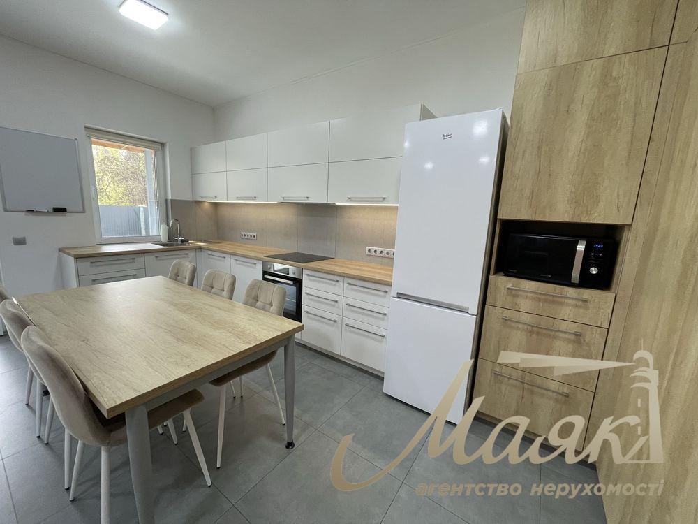 Modern house 124 sq. m. on a plot of 6 hectares for long-term rent in Chabany. Planning: - kitchen - living room - terrace - 4 bedrooms - 2 bathrooms. Warm floor throughout the house. Well, septic tank, shed for two cars. Heating electric boiler or solid fuel boiler. There is a generator. To metro Teremki 7 km, 11 min by car. Near the forest, quiet, cozy place. #30163